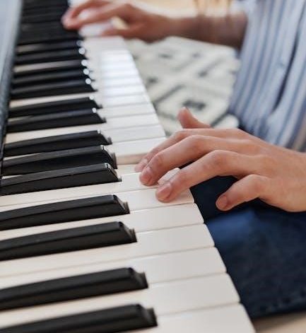 Piano scale mastery relies on techniques like the thumb-under and crossing fingers methods. PDF resources from UVU and MuseScore.com illustrate these, improving technique.